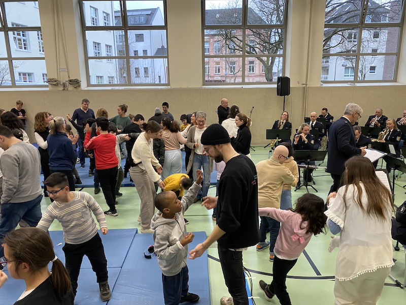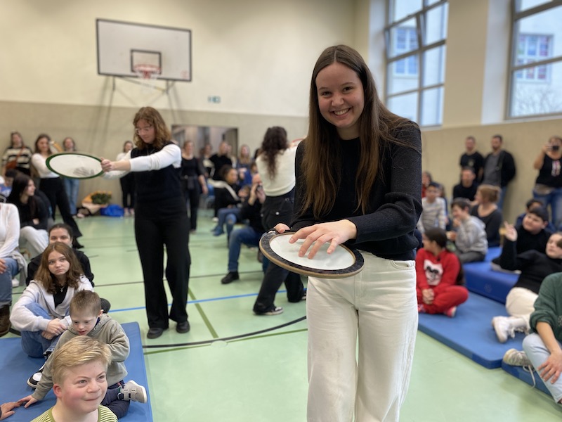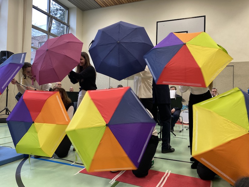 Von Montag bis Donnerstag durften unsere Schüler:innen einige Musikstücke aus dem Repertoire des Orchesters gemeinsam mit den Studierenden spielerisch erarbeiten. In kleinen Gruppen wurden Lieder wie „Eye of the tiger“, „Frozen“ und „Singing in the rain“ mit allen Sinnen erlebt.